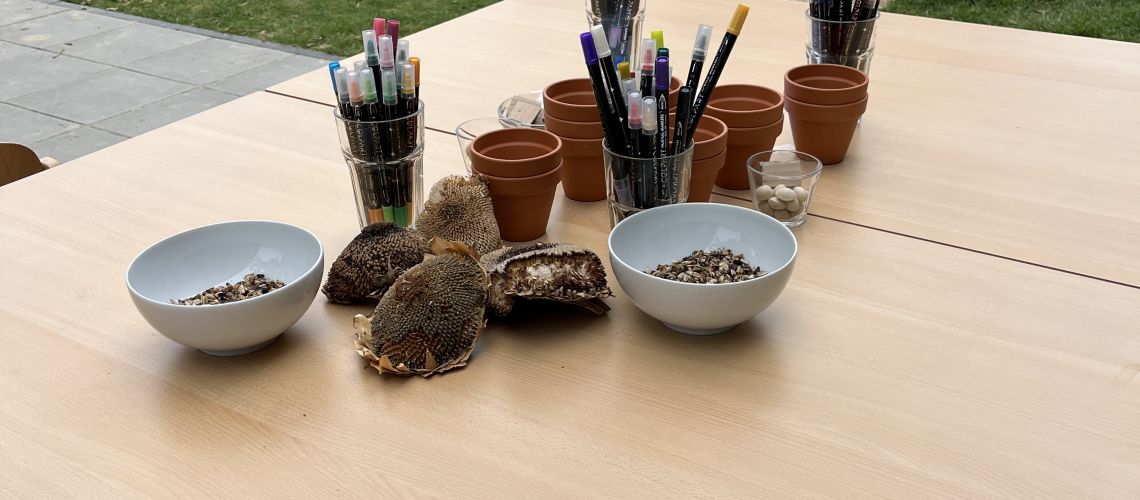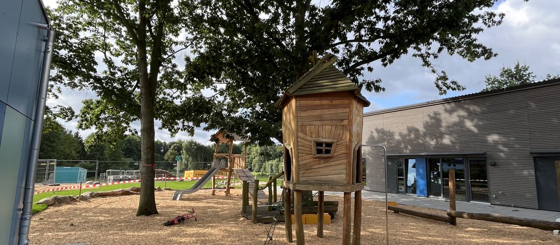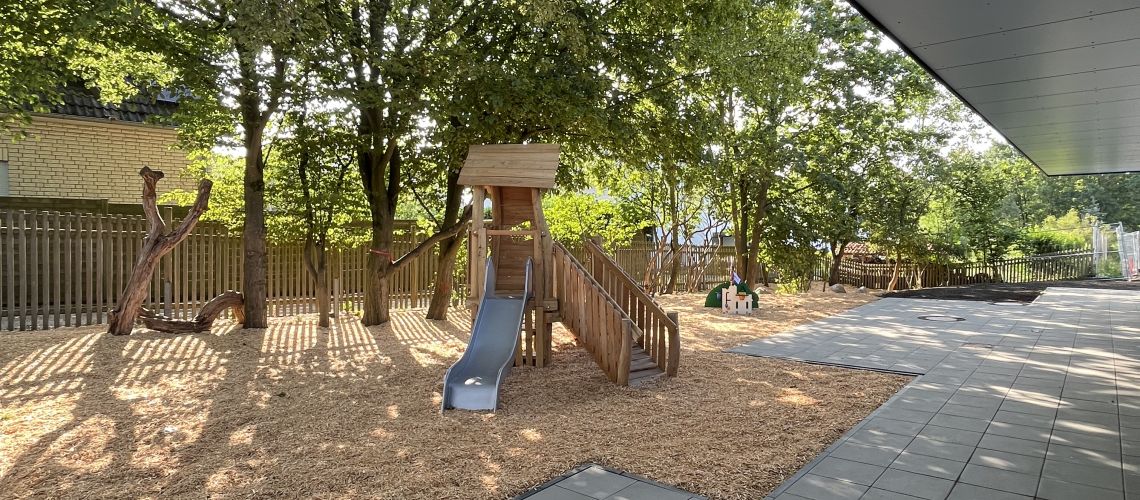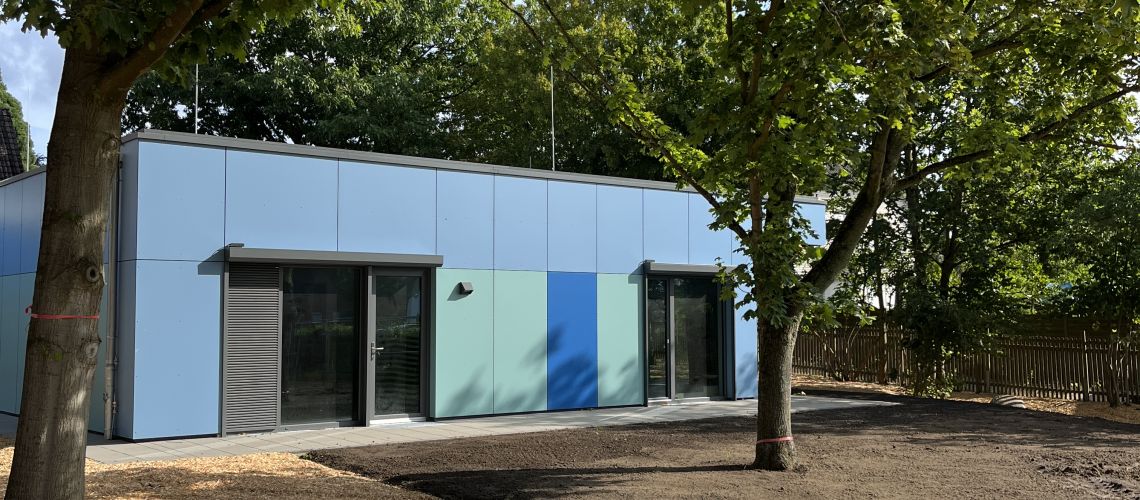 Der Neubau der Kita ist eingeschossig und besteht aus einem Riegel mit Pultdach, der parallel zur westlichen Grundstücksgrenze ausgerichtet ist und in dem sich ein Mehrzweckraum, der Personalraum, drei Gruppenräume des Kindergartens und die Nebenräume befinden. Dem Riegel schließt sich ein L-förmiger Flachdachbau an, der den Eingangsbereich, die Küche mit angrenzendem Essbereich sowie die Räumlichkeiten der Kinderkrippe beinhaltet. Der Neubau ist insgesamt für drei Kindergartengruppen mit jeweils 25 Plätzen und zwei Krippengruppen mit jeweils 15 Plätzen konzipiert.