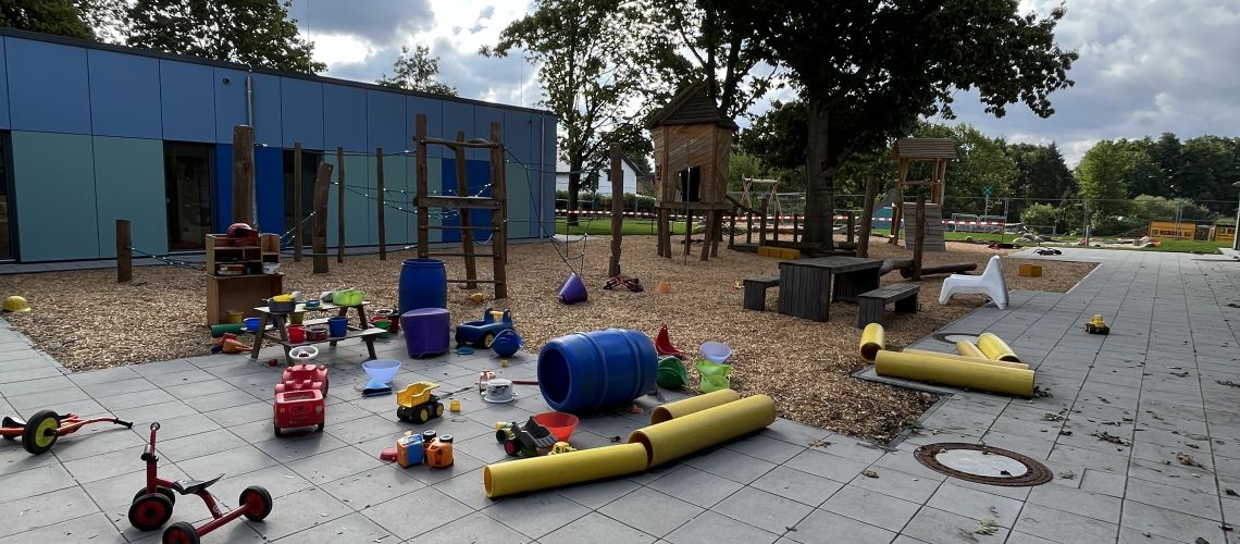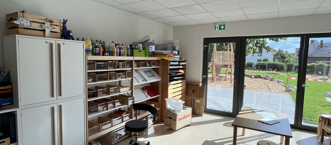 Der Neubau der Kita ist eingeschossig und besteht aus einem Riegel mit Pultdach, der parallel zur westlichen Grundstücksgrenze ausgerichtet ist und in dem sich ein Mehrzweckraum, der Personalraum, drei Gruppenräume des Kindergartens und die Nebenräume befinden. Dem Riegel schließt sich ein L-förmiger Flachdachbau an, der den Eingangsbereich, die Küche mit angrenzendem Essbereich sowie die Räumlichkeiten der Kinderkrippe beinhaltet. Der Neubau ist insgesamt für drei Kindergartengruppen mit jeweils 25 Plätzen und zwei Krippengruppen mit jeweils 15 Plätzen konzipiert.